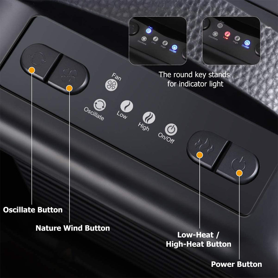 Auto-oscillate for 60°; Portable heater with handle, easy to move from room to room.